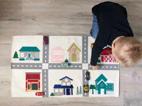 This car play mat was one I made years earlier with fabric, painfully stitching each building down to the base fabric. It took so much time and wasn't the best quality. Using iron on vinyl was a game changer, enough that I was willing to remake the project!