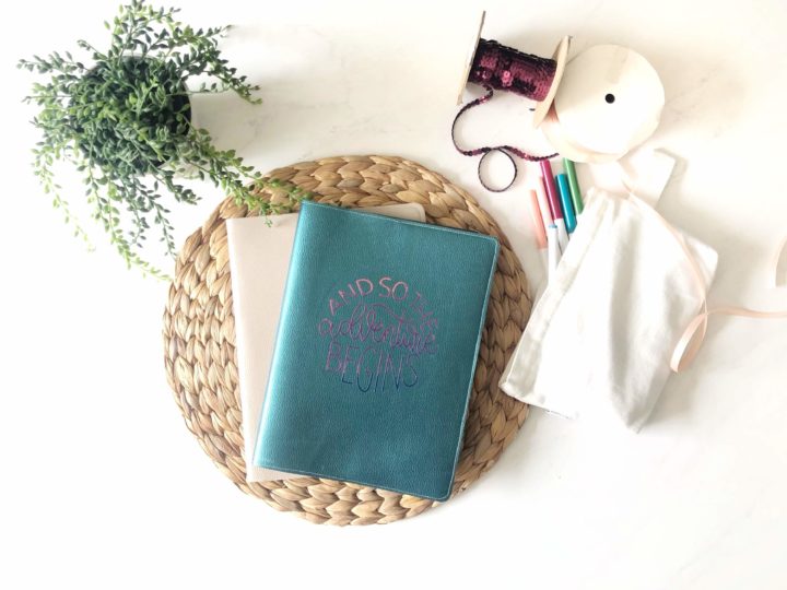 This leather journal cover can be used in many ways. You can follow this tutorial using a leather or faux leather journal, use a iron on vinyl. If you wanted to use regular adhesive vinyl to attach it to a paper notebook, that works too!