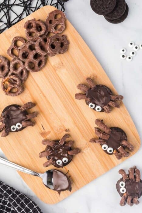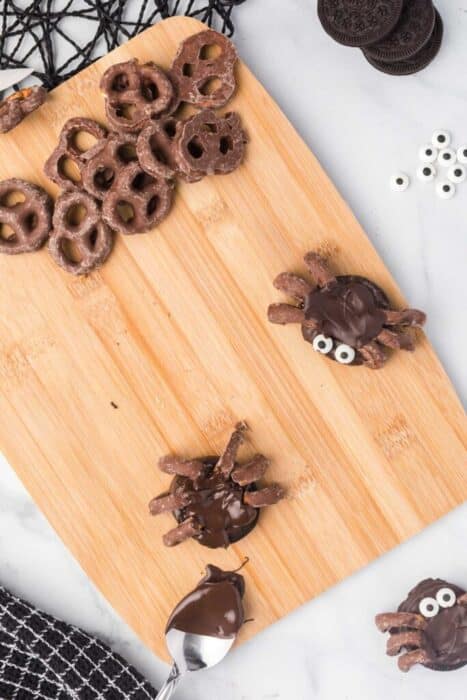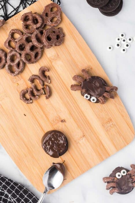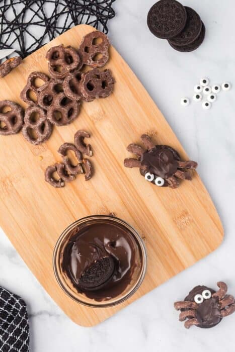 - Gather the chopped (halved) chocolate pretzels and place into the melted chocolate. Spiders can have two or three legs on each side, whichever fits best! Dab some chocolate on top for extra strength if needed.