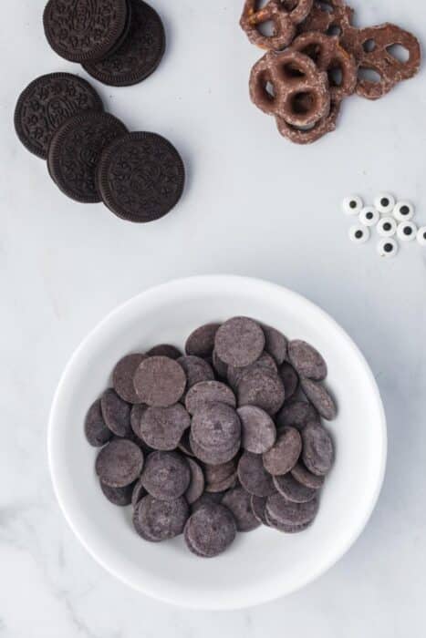 - Melt chocolate wafers and stir until smooth. Coat the top of one oreo with melted chocolate.