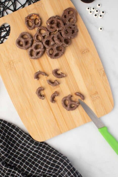 We used chocolate-covered pretzels to get the bumpy look of spider legs. Precut or supervise the chopping! Other options for legs could be pretzel sticks or poky sticks.