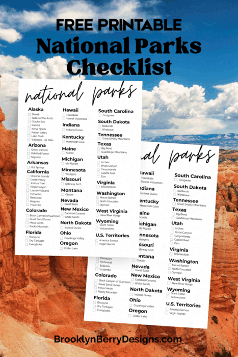 This printable national parks checklist is a one page wonder! It lists all 63 national parks in alphabetic order. You can download, save and print this and use it to mark off each national park as you visit!